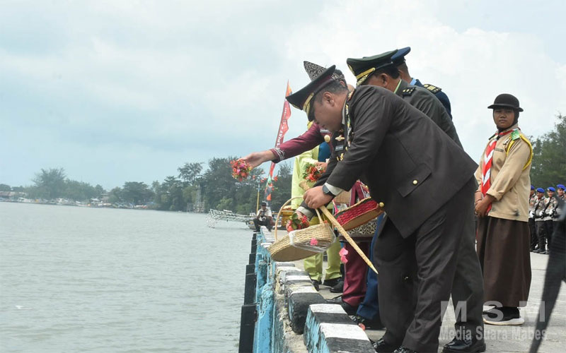 MediaSuaraMabes, Babel – Kapolres Belitung Timur AKBP Indra Feri Dalimunthe, S.H.,S.I.K., M.H., pimpin Upacara Pelarungan Bunga di Pelabuhan Umum Manggar Desa Baru Kecamatan Manggar Kabupaten Belitung Timur,Minggu (17/08/2025).