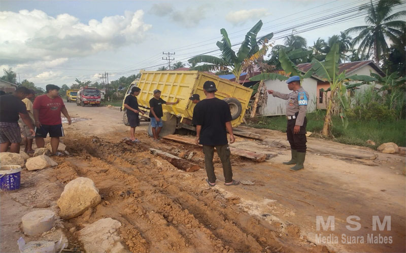 “Kami akan berkoordinasi dengan instansi terkait agar segera dilakukan tindakan lanjut. Karena apabila dibiarkan sejumlah kerusakan di beberapa titik bisa membahayakan atau menyebabkan kecelakaan lalu lintas. Untuk sementara masyarakat sekitar melakukan penimbunan dengan tanah dan juga kayu agar kendaraan roda 4 bisa lewat,” tutup Aiptu Pastiawan.
