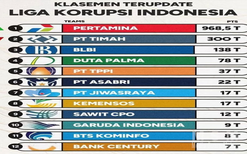 Korupsi di tubuh institusi pemerintah dalam pengelola minyak mentah dan produk kilang oleh PT Pertamina Patra Niaga, sub holding dan Kontraktor Kontrak Kerja Sama (KKSM) mencapai Rp.968,5 triliun atau hampir mencapai Rp.1 kuadriliun dan disusul dengan kasus korupsi PT Timah dengan kerugian negara mencapai 300 triliun yang diungkap pada tahun 2024 dengan melibatkan beberapa pihak.