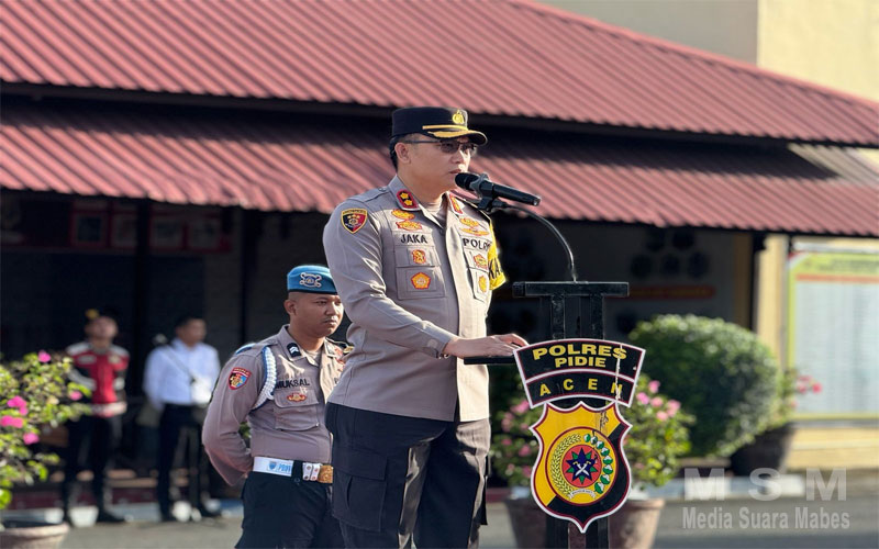 MediaSuaraMabes, Sigli – Kapolres Pidie AKBP Jaka Mulyana, SIK, MIK memimpin pelaksanaan Apel Jam Pimpinan yang diikuti oleh personel Polres Pidie di Lapangan Apel Polres Pidie, Senin pagi (7/4/2025).