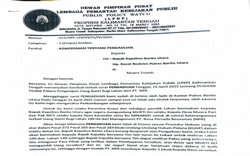 Dalam laporan sebelumnya Jhon Kenedy salah seorang ketua LSM Lembaga Pemantau Kebijakan Publik (LPKP) Barito Utara 2/5/2025 menyampaikan, “Seminggu sebelumnya saya sudah menyampaikan laporan melalui SPKT Polres Barito Utara sebagaimana surat kami Nomor:022/DPP-LPKP/KTG/IV/2025 Dengan Perihal: Pengaduan Dugaan Tindak Pidana Penggelapan HAK karena sudah lebih dari seminggu belum ada respon maka kemaren kembali kami sampaikan kembali surat Nomor:023/DPP-LPKP/KTG/IV/2025 Perihal: Kompirmasi Tentang Pengaduan, Adapun yang kami laporkan yaitu 2 Oknum Kepala Desa yang bersangkutan dan satu orang inisial (M) atau salah satu masyarakat yang berasal dari kabupaten Barito Utara menjadi anggota DPRD di Kubar (Kaltim) Karena kalau dibilang uang tersebut untuk pembebasan lahan, sepengetahuan kami ada mereka tidak memiliki hak kelola yang nyata pada lahan 190 Ha. Yang katanya dianggarkan rencana pemberian taliasih oleh PT. NPR. Kata Jhon Kenedy