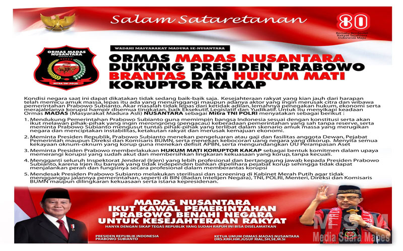 “Jika rakyat ingin bangkit makmur, adil dan sejahtera, serta ingin Indonesia maju, tidak ada pilihan lain rakyat harus bersatu melawan korupsi. Harus bersatu mendukung Presiden Prabowo Subianto melawan korupsi,” tegas Jusuf Rizal Presiden LSM LIRA dan Ketum Ormas Masyarakat Madura Asli (Madas) Nusantara itu
