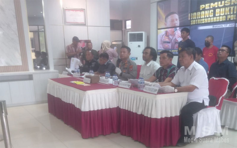 IndoGlobalNews (Jaringan MSM), Batam – Kaplresta Barelang Kombes Pol H. Ompusunggu, S.K.I, M.Si., di dampingi kasat resnarkoba polresta barelang AKP deni langie S.I.K .,M.H, dan kasi humas polresta barelang, iptu budi santoso S.H. memimpin konferensi pres pemusnahan barang bukti narkotika jenis sabu seberat 153,06 gram kegiatan ini di laksanakan secara tranparan di hadapan pihak kejaksaan ,pengadilan dan intansi terkait lainnya bertempat di lobby kapolresta barelang pada jumat 17/01/2025.