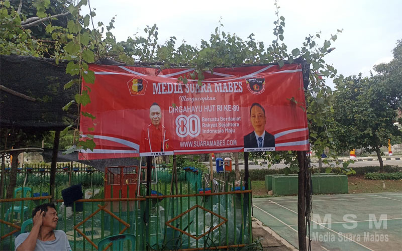 “Media Suara Mabes Mengucapkan Dirgahayu HUT RI ke-80 – Bersatu, Berdaulat, Rakyat Sejahtera, Indonesia Maju”, dan dipasang di dekat kantor Sekretariat RW 014 sebagai bentuk dukungan terhadap semangat kemerdekaan serta rasa nasionalisme yang tinggi.