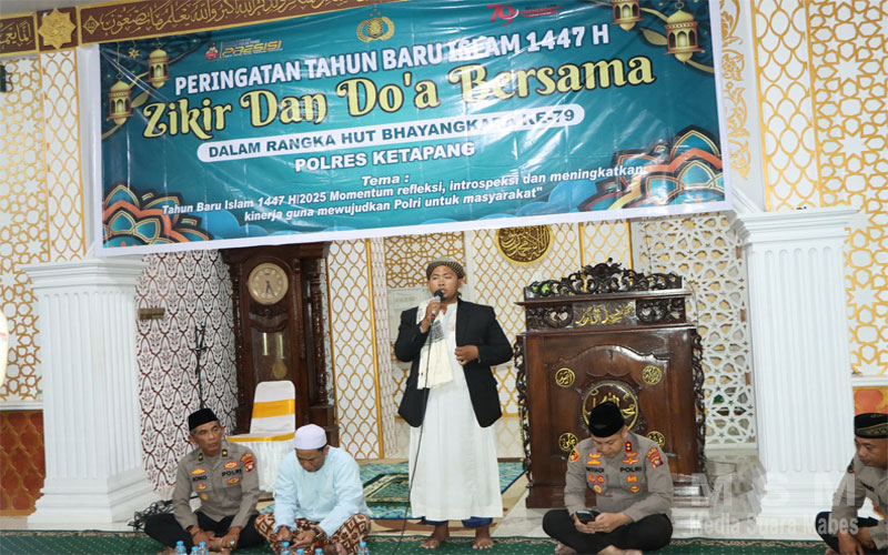 MediaSuaraMabes, Ketapang – Dalam rangka menyambut Tahun Baru Islam 1 Muharram 1447 Hijriah, Kepolisian Resor (Polres) Ketapang menggelar kegiatan zikir dan doa bersama yang berlangsung khidmat di Masjid An-Nur Komplek Gedung Polres Ketapang Jalan Brigjend Katamso Nomor 01 Ketapang, Kamis Malam (26/6) Pukul 18.00 Wib. Kegiatan ini dihadiri oleh Kapolres Ketapang AKBP Setiadi, S.H., S.I.K., M.H., para pejabat utama, personel Polres, Bhayangkari, serta warga masyarakat sekitar. Kegiata doa dan zikir bersama kali ini mengangkat tema “ Peringatan Tahun Baru Islam 1447 Hijriyah Sebagai Momentum Refleksi dan Introspeksi Diri meningkatkan kinerja guna mewujudkan Polri untuk masyarakat “.