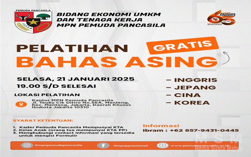 IndoGlobalNews (Jaringan MSM), Jakarta – MPN Pemuda Pancasila melalui Bidang Ekonomi UMKM dan Ketenagakerjaan mengadakan pelatihan bahasa asing sebagai bagian dari upaya peningkatan kapasitas kader. Pelatihan ini bertujuan untuk membekali para kader dengan keterampilan bahasa yang dapat menunjang perkembangan ekonomi dan peningkatan daya saing di pasar global. Bahasa yang dipelajari dalam pelatihan ini meliputi bahasa Inggris, Jepang, China, dan Korea, yang sangat relevan dengan berbagai peluang di sektor ekonomi dan ketenagakerjaan.