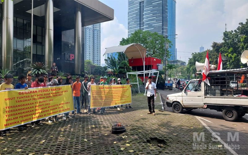 MediaSuaraMabes, Jakarta – Masyarakat kabupaten Oku yang mengatasnamakan gerakan peduli rakyat mendatangi kantor komisi pemberantasan korupsi KPK dan menggelar aksi unjuk rasa rabu 16/04/2025. menuntut agar kasus suap yang terjadi di kabupaten Oku yang telah menangkap tangan 6 orang dan sudah di tetapkan sebagai tersangka, yang mana marak di lansir dari pemberitaan media nasional dan lokal ke 6 orang tersebut terlibat dalam kasus suap dinas PU Bina marga kabupaten Oku yang di tangkap oleh tim KPK pada waktu lalu 15/02/2025 yang mana saat ini mereka sudah di tahan di rumah tahanan KPK