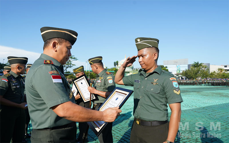 MediaSuaraMabes, Kubu Raya – Pangdam XII/Tanjungpura Mayjen TNI Jamallulael, S.Sos., M.Si., memberikan penghargaan kepada Prajurit Berprestasi. Penghargaan diberikan usai pelaksanaan upacara hari Senin di Lapangan Tidayu, Makodam XII/Tpr, Senin (28/4/2025).