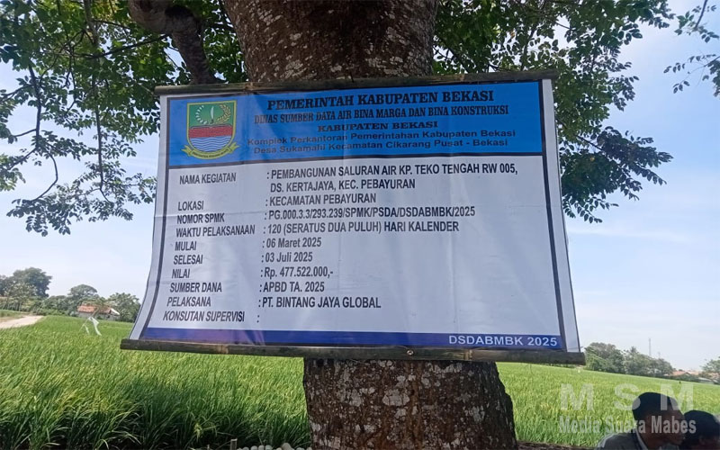 MediaSuaraMabes, Kab. Bekasi – Pembangunan Saluran air di Kampung Teko Tengah RW.005, Desa Kertajaya, Kecamatan Pebayuran, Kabupaten Bekasi, Anggaran APBD Tahun 2025 dari Dinas Sumber Daya Air Bina Marga Dan Bina Kontruksi (DSDABMBK).