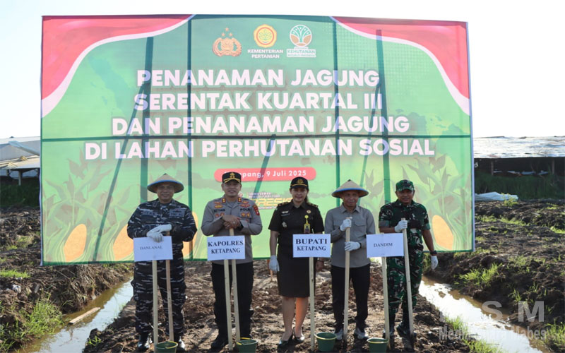 MediaSuaraMabes, Ketapang Kalbar – Kapolres Ketapang Polda Kalbar AKBP Setiadi, S.H., S.I.K., M.H., bersama jajaran forkopimda Kabupaten Ketapang melaksanakan penanaman bibit jagung serentak Kuartal III. Kegiatan penanaman bibit jagung tersebut digelar di area lahan Kawasan Industri Ketapang Ecology and Agriculture Forestry Industrial Park di Desa Sungai Awan Kanan Kecamatan Muara Pawan Kabupaten Ketapang, pada Rabu (09/07/2025) Pukul 14.00 Wib.