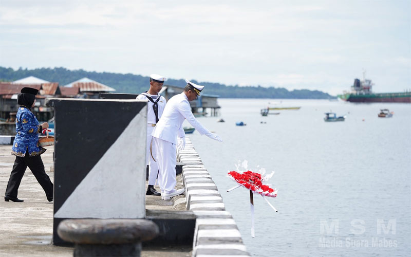 Suasana semakin khidmat ketika inspektur upacara meletakkan karangan bunga di laut sebagai simbol penghormatan tertinggi kepada para pejuang bangsa yang gugur di medan laut.