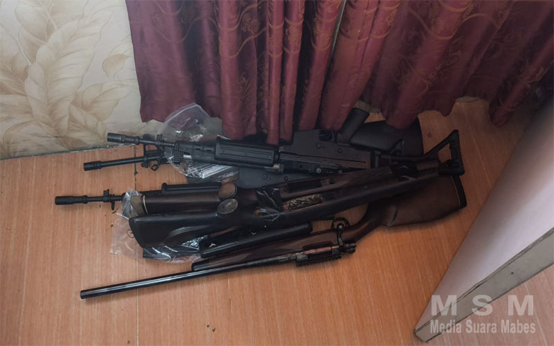 Barang bukti yang berhasil diamankan dari kedua tersangka mencakup berbagai jenis senjata api laras pendek dan panjang, ratusan butir amunisi dari berbagai kaliber, detonator, serta beberapa dokumen dan barang elektronik. Rincian Barang Bukti.