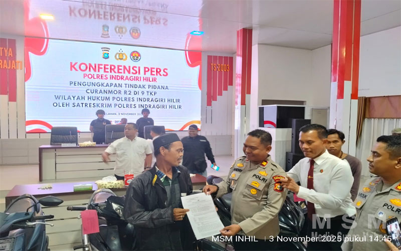 MediaSuaraMabes, Kab. Indragiri Hilir Tembilahan – Kepolisian Resor (Polres) Indragiri Hilir menggelar konferensi pers pada hari ini, Senin (3/11/2025), di halaman Mapolres Inhil. Kegiatan tersebut dipimpin langsung oleh Kapolres Inhil AKBP Farouk Oktora, didampingi Kasat Reskrim Polres Inhil Iptu M. Rizal, guna memaparkan hasil pengungkapan kasus pencurian kendaraan bermotor (curanmor) yang terjadi di sembilan tempat kejadian perkara (TKP) berbeda.
