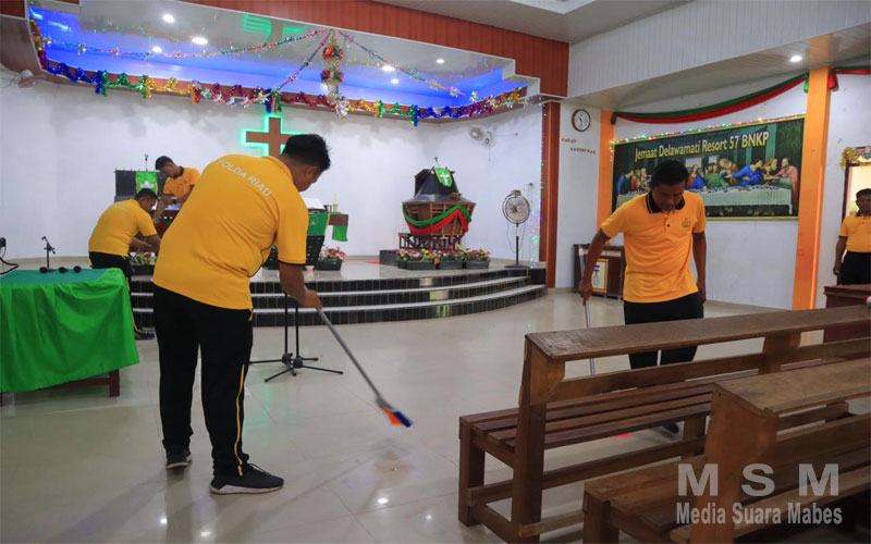 Kegiatan gotong royong diawali dengan pembersihan lingkungan sekitar Gereja BNKP Delemawati. Para personel Polres Kampar bekerja sama dengan jemaat gereja membersihkan halaman gereja, memotong rumput, dan membersihkan selokan. Suasana kebersamaan dan kekeluargaan tercipta selama kegiatan berlangsung. Hal ini menunjukkan sinergi yang baik antara Polri dan masyarakat dalam menjaga kebersihan dan keindahan lingkungan.