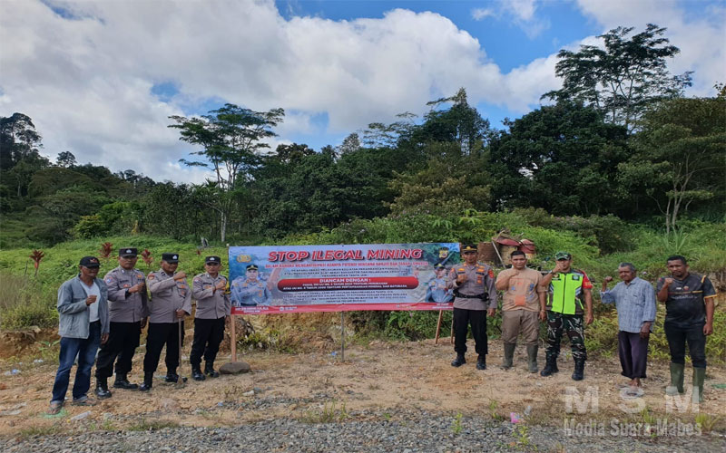 MediaSuaraMabes, Sigli – Polsek Geumpang Polres Pidie bersama Koramil 17 Geumpang dan masyarakat setempat melaksanakan pemasangan spanduk himbauan Stop Kegiatan Illegal Mining (PETI) dan Illegal Logging di kawasan hutan Kecamatan Geumpang, Kabupaten Pidie, Minggu (28/9/2025).