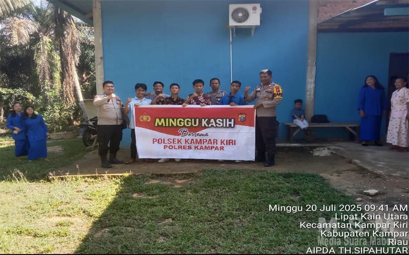 MediaSuaraMabes, Kampar – Dalam upaya meningkatkan kepercayaan publik dan mewujudkan keamanan dan ketertiban masyarakat (Harkamtibmas) yang kondusif, Polsek Kampar Kiri melaksanakan kegiatan “Minggu Kasih”. Minggu (20/7/2025), sekitar pukul 09.20 WIB, tiga personel Polsek Kampar Kiri, Aipda Th. Sipautar, Bripka Herman S., dan Bripka Jansen Nababan, melakukan kunjungan ke Gereja Gereja Protestan di Indonesia (GSPDI) Desa Sungai Paku untuk bertemu dan berinteraksi langsung dengan jema’at.