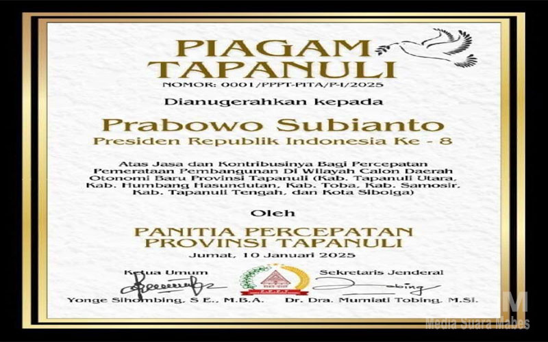 “Penetapan nama Prabowo Subianto Presiden RI ke – 8 sebagai penerima Piagam Tapanuli tahun 2025 sudah berdasarkan ketentuan Tim Piagam Tapanuli (TPT), Pak Prabowo sangat layak dan pantas dianugerahi Piagam Tapanuli”, kata Penulis Buku Jokowi Maestro Pembangunan Indonesia.