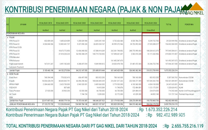 Ia juga menegaskan bahwa PT Gag Nikel memiliki izin Penambangan Bijih Nikel, bukan Galian C, yang berpengaruh terhadap skema pajak yang berlaku.