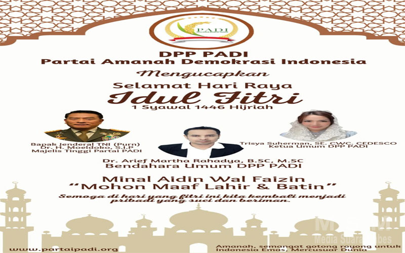 Ketua Umum Partai PADI,Trisya Suherman mengatakan,di momen yang penuh berkah ini, saya mengucapkan selamat merayakan Idul Fitri bagi Sahabat Muslimku yg merayakan dan Seluruh Dewan Pembina, Dewan Pengawas, DPP, DPD, Anggota & Para Pendiri Organisasi yang saya pimpin : Partai PADI, Perkumpulan Moeldoko Center, Perkumpulan Pengusaha Bela Bangsa, Perkumpulan Milenial Cinta Budaya, Yayasan Global CEO Indonesia, Yayasan Perempuan Bersinar (Bersih Narkoba) juga seluruh Mitra Kerja, Karyawan, Relasi semua,”tutupnya