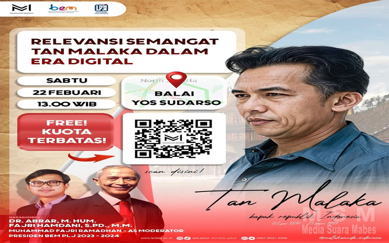 IndoGlobalNews (Jaringan MSM), Jakarta – Pada tanggal 22 Februari 2025, tepatnya pukul 13.00 WIB, Balai Yos Sudarso Jakarta Utara akan menjadi saksi dari sebuah acara penting yang mengusung tema besar: “Relevansi Semangat Tan Malaka dalam Era Digital.” Acara ini diselenggarakan oleh BEM Politeknik LP3I bekerja sama dengan Malaka Muda Indonesia, dengan tujuan untuk menggali lebih dalam tentang pemikiran dan semangat Tan Malaka, serta relevansinya dalam menghadapi tantangan di era digital saat ini.