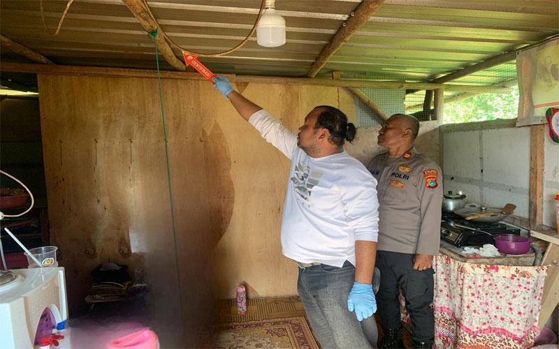 Pintu belakang rumah kemudian didobrak, dan korban ditemukan dalam keadaan tidak bernyawa dengan seutas tali tambang plastik hijau melilit lehernya.
